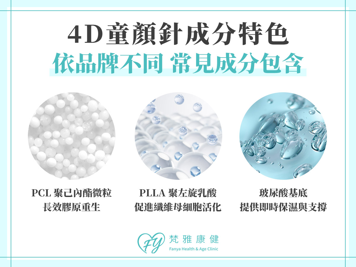(4D Soft Lift)是一種「複合型膠原再生注射」,以多層次、立體拉提與膠原重建為概念設計,能同時改善鬆弛、皺紋、輪廓下垂與膚質暗沉等老化問題。它融合了玻尿酸的立即澎潤與膠原蛋白增生針(如聚左旋乳酸PLLA、聚己內酯PCL)的長效修復效果,因此被稱為「新一代會自己生膠原蛋白的童顏針」。