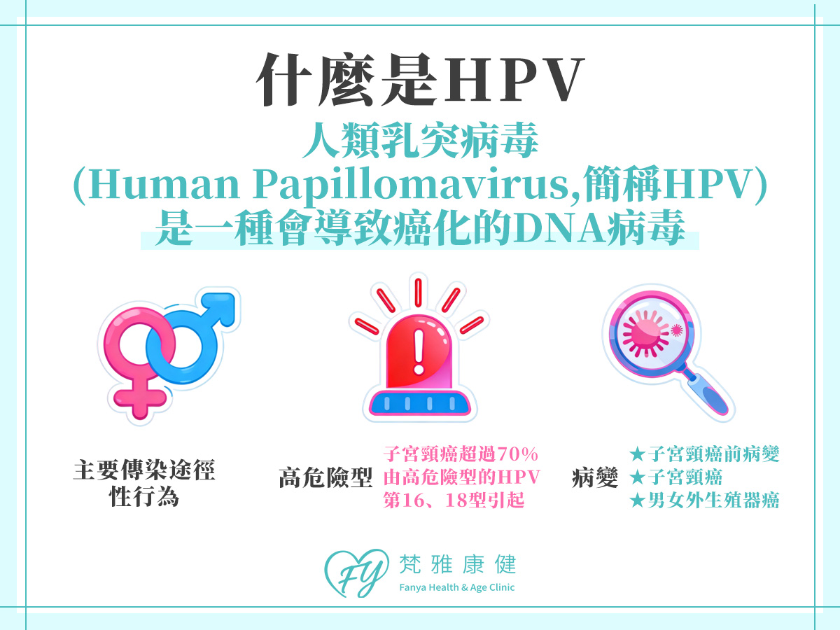 HPV 是一種DNA 病毒,屬於乳突瘤病毒科乳突瘤病毒屬。該類病毒感染人類的表皮與黏膜組織,目前約有200 種類型的HPV 被判別出來。有些時候HPV 入侵人體後會引起疣甚至癌症,但大多數時候則沒有任何臨床症狀。多數的HPV 感染會受到免疫系統的辨識並獲得控制,若受到HPV 感染的細胞沒有自行清除且長期持續生長,可能導致HPV相關的癌症。