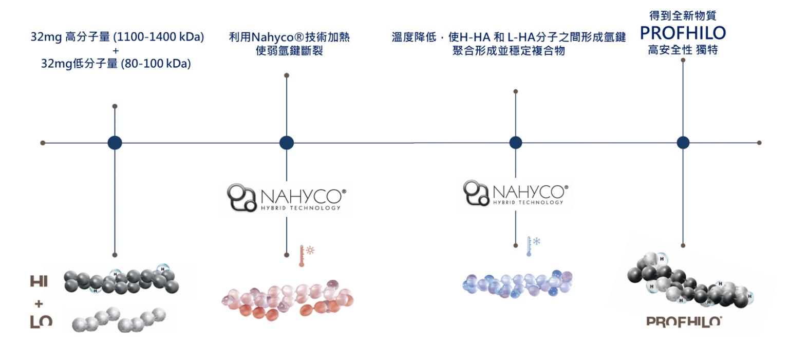 Profhilo 逆時針運用瑞士專利 NAHYCO® Hybrid Technology,將高分子與低分子玻尿酸完美結合,因此與人體組織具高相容性,代謝快速且安全性極佳。這種創新結構讓產品在維持穩定度的同時,仍保有高度流動性與再生活性。
